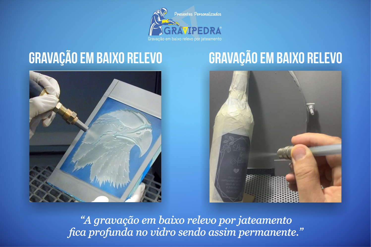 A Gravipedra® é uma empresa especializada em gravações em baixo relevo por jateamento em vidro, pedra, metal, entre outros materiais, usando as mais avançadas técnicas, podemos gravar desenhos e textos com grande precisão e detalhe.