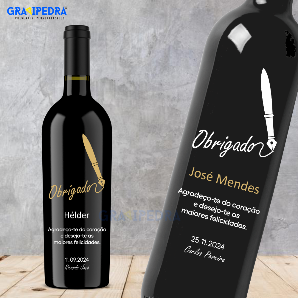 - Uma garrafa de vinho personalizada é o presente perfeito para expressar a sua gratidão de forma elegante e significativa. Feita sob medida para ocasiões especiais, traz uma mensagem personalizada de agradecimento, tornando-a única e inesquecível. Ideal para celebrar momentos marcantes, parcerias, amizades ou contribuições importantes, combina um toque de sofisticação com um gesto sincero de apreço. Um presente que une sabor, elegância e emoção!