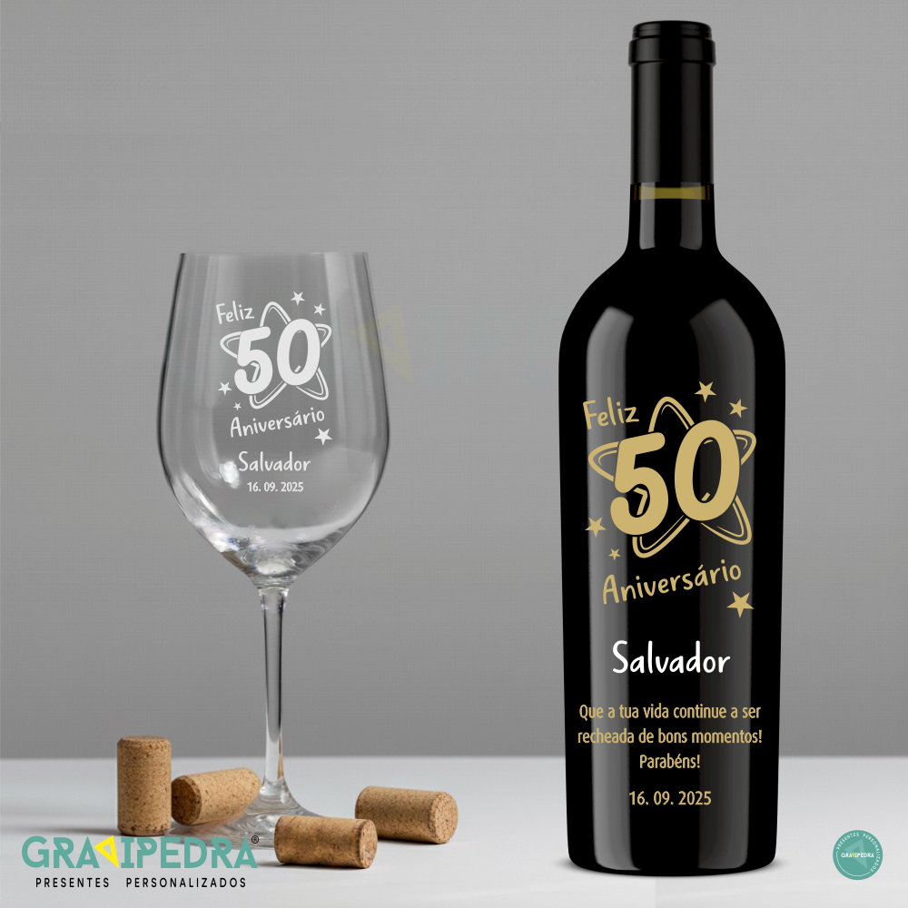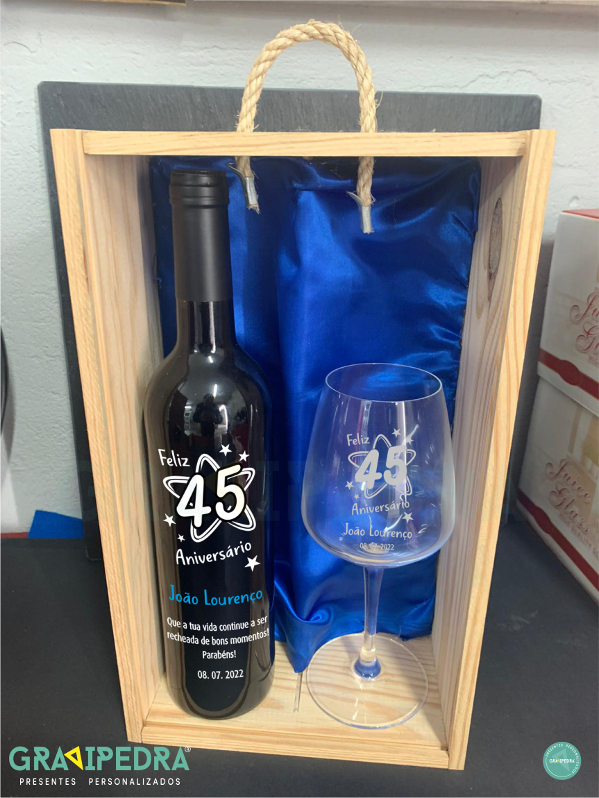 Pack Especial Aniversário - Garrafa + Copo + Caixa Madeira - PACKGCFA57