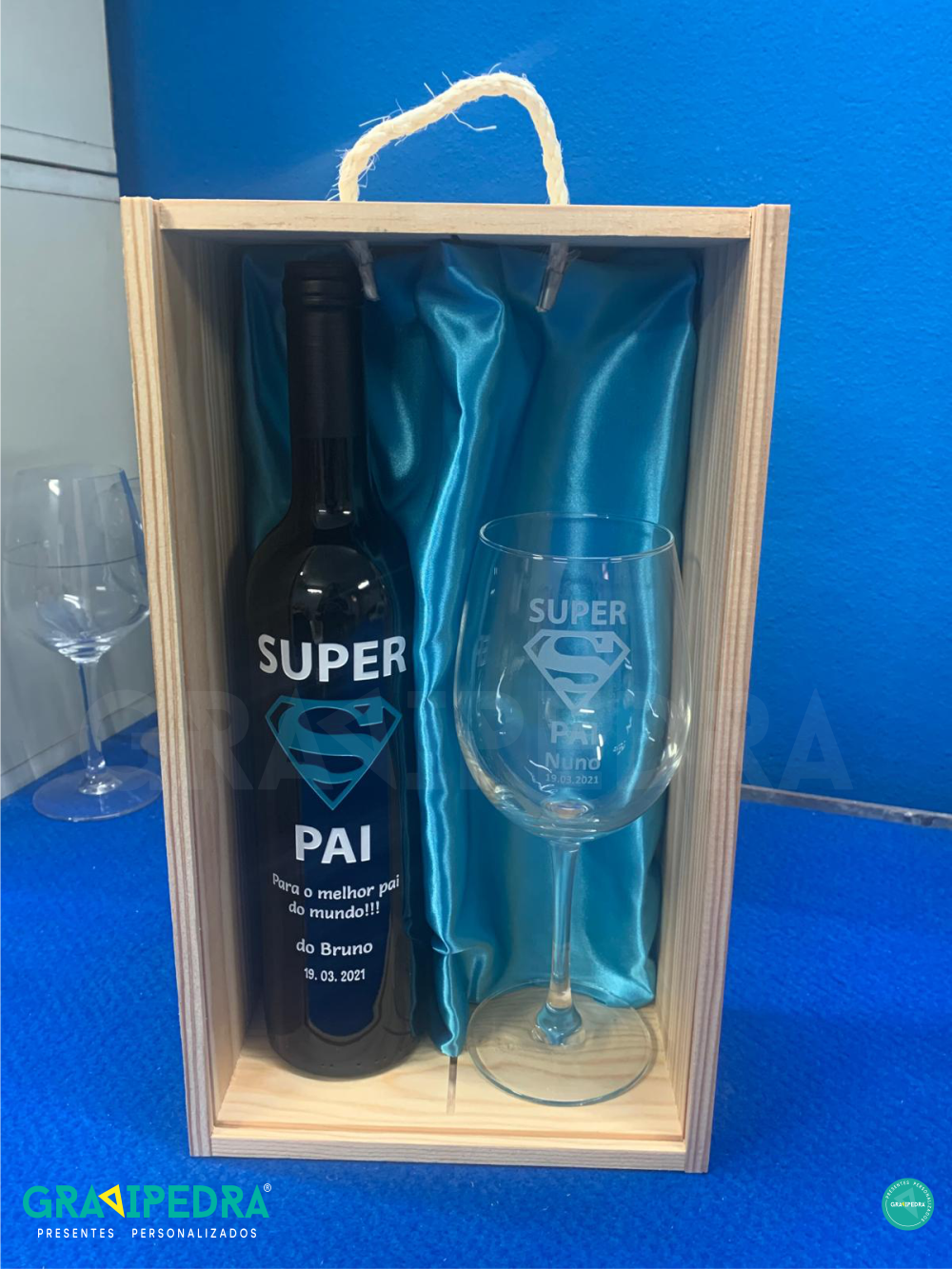 Pack de garrafa vinho + copo vidro + caixa de madeira com pano e tampa em acrilico