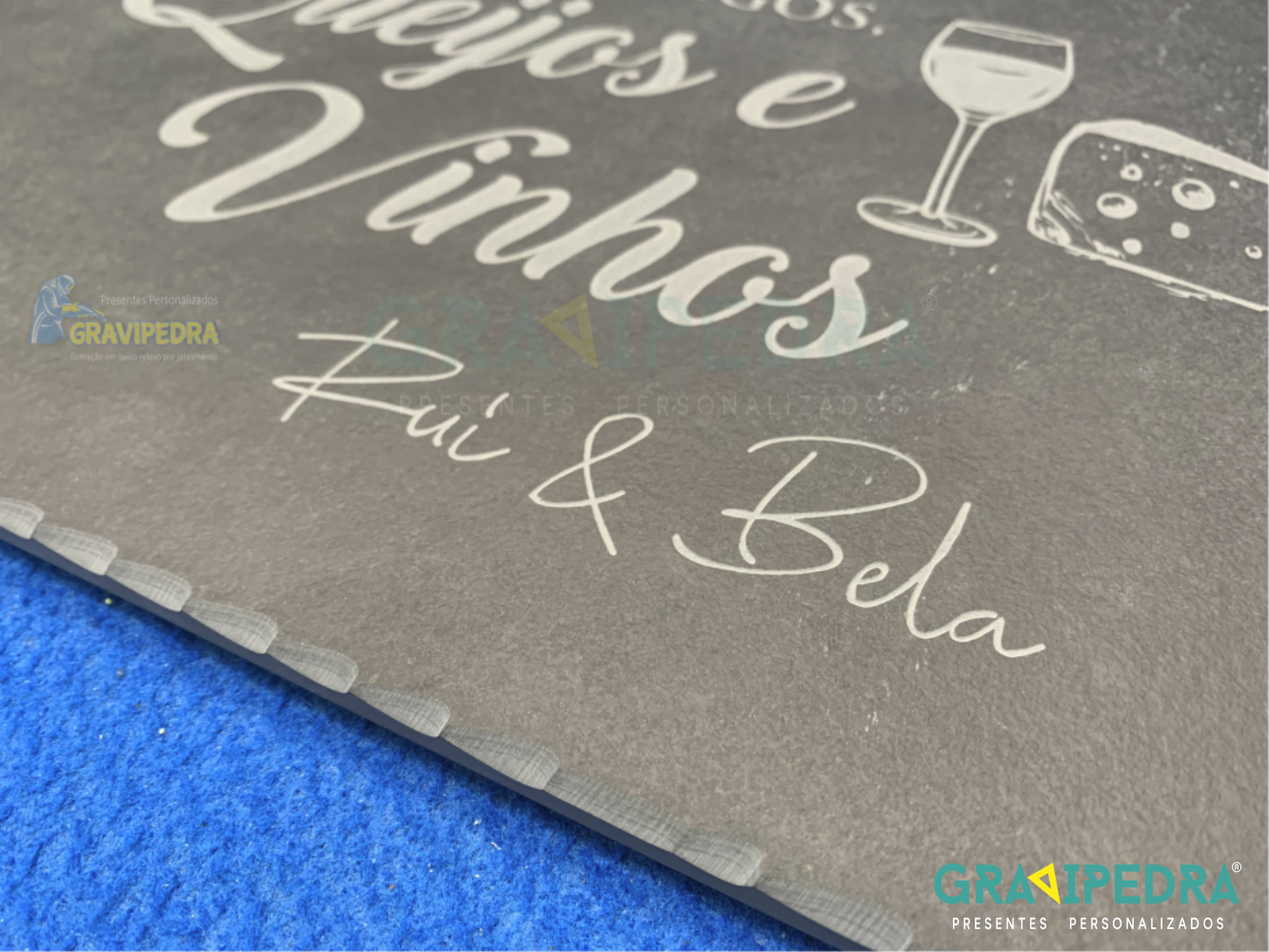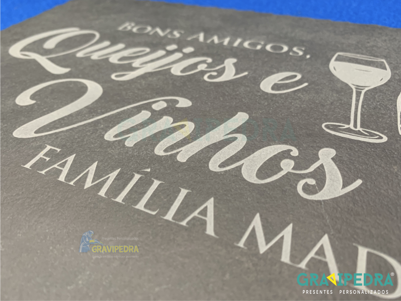 Feita em pedra ardosia natural com gravação em baixo relevo por jateamento da silhueta queijo c/ fotografias.
